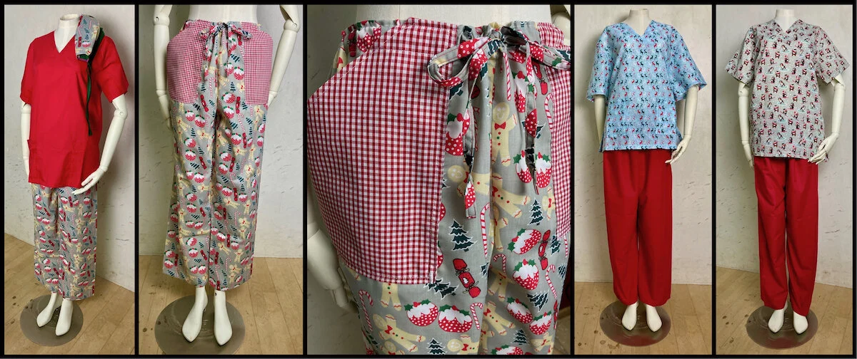 West London Kidney Patients Association ordinarily fund Christmas decorations for 13 renal units, but this year that is not possible due to COVID-19 restrictions. We stepped in and matched a need and a wish – the staff needed scrubs, and we had some “festive” materials available to use. The outcome is a range of sensible but festive Christmas scrubs, matched with festive scrub hats and headbands. We used donated material to be more eco-friendly, sustainable, and reworked some unallocated scrubs to make them into festive sets. As well as the renal units, these sets have been distributed to other related services like the Live Kidney Donor team and the Renal Rapid Assessment team.